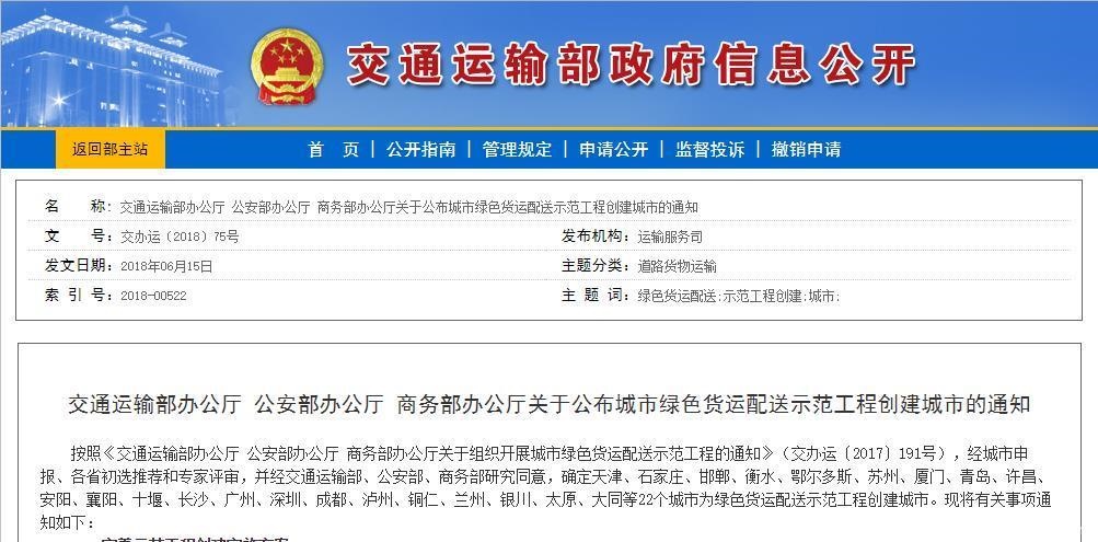 按照(zhào)《交通(tōng)運輸部辦公廳 公安部辦公廳 商務部辦公☆<δγ廳關于組織開(kāi)展城(chéng)市(shì)綠(§&&↑lǜ)色貨運配送示範工(gōng)程的(de)通(tφδ∏₩ōng)知(zhī)》(交辦運﹝2017﹞191号),經城(chéng)市(s≈λhì)申報(bào)、各省初選推薦和(hé)專家(jiā)評審'€π,并經交通(tōng)運輸部、公安部、商務部研究同意,↕✔确定天津、石家(jiā)莊、邯鄲、衡水(shuǐ)、鄂爾多(duō)斯、蘇州£♦λ、廈門(mén)、青島、許昌、安陽、襄陽、十堰、長(chán©πg)沙、廣州、深圳、成都(dōu)、泸州、♦♦₩φ銅仁、蘭州、銀(yín)川、太原、大(dà)同等22個(gè)城(chéng¶→♣)市(shì)為(wèi)綠(lǜ)色貨運配送示範工(gōng)程" 創建城(chéng)市(shì)。現(xi×₩↑₽àn)将有(yǒu)關事(shì)項通(tō™↕ng)知(zhī)如(rú)下(xià):