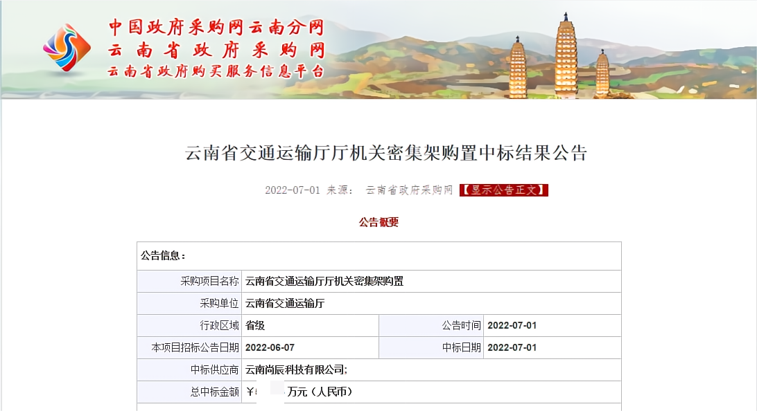 2022年(nián)6月(yuè)29∞£•日(rì),雲南分智科技有限公司參與了(le)雲南(nán)省交通(tōng)運輸廳關于雲南(nán)省交通(tōng)運輸廳廳機(jī)關密集架購(gòπ ÷♣u)置招标活動的(de)項目投标,并在本次招标活動中有(yǒu)↑ ∑ 幸中标,與雲南(nán)省交通(tōng)運輸廳達成合作©ε(zuò)。